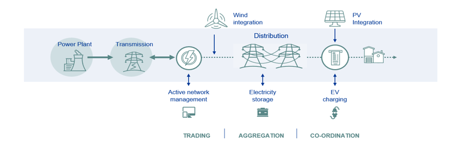 Modern DSOs manage bi-directional flows from distributed energy resources (DER), storage, EVs, and flexible demand. They require advanced monitoring, forecasting, and control for stability. DSOs now act as neutral market facilitators, coordinating flexibility, energy trading, and ancillary services for resilience and efficiency. Figure 1 illustrates this evolution in the distribution business.